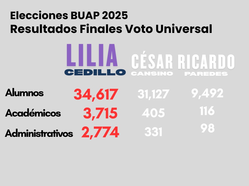 Lilia Cedillo retuvo la rectoría de la BUAP en la elección de ayer miéroles con una myoría del voto universal a su favor. El hecho más relevante, sin embargo, es el muy importante número de votos que los candidatos opositores obtuvieron entre los estudiantes.