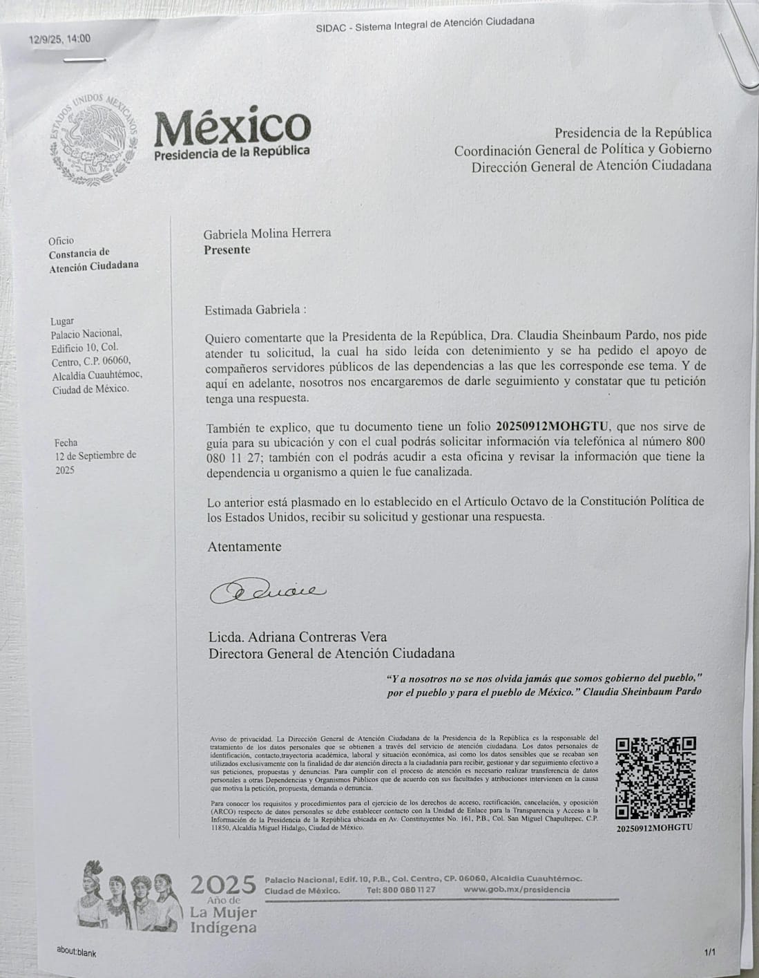 La siguiente es la carta que dirige a la presidenta Claudia Sheimbaum la maestra Gabriela Molina Herrera, quien expone la situación que prevalece en la Universidad Pedagógica Nacional, Unidad 211 Puebla, centro de trabajo en el que ha sido víctima de actos de represión, hostigamiento laboral, exclusión académica y suspensión de salario que he sufrido como consecuencia directa de mi participación en la denuncia pública y documentada sobre la asignación irregular de plazas docentes en esa institución.