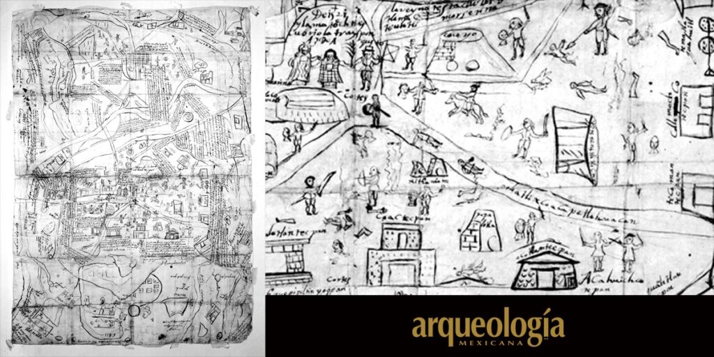 El mapa representa los lugares donde se efectuó el sacrificio de los indios, por un lado, indios con macanas, arcos, rodelas, enfrentando a españoles, por la otra parte se observan, brazos y piernas cercenadas, esparcidas en el suelo. Mapa de Cholula. Abajo junto a la imagen muestra los lugares donde masacraron a cholultecas.