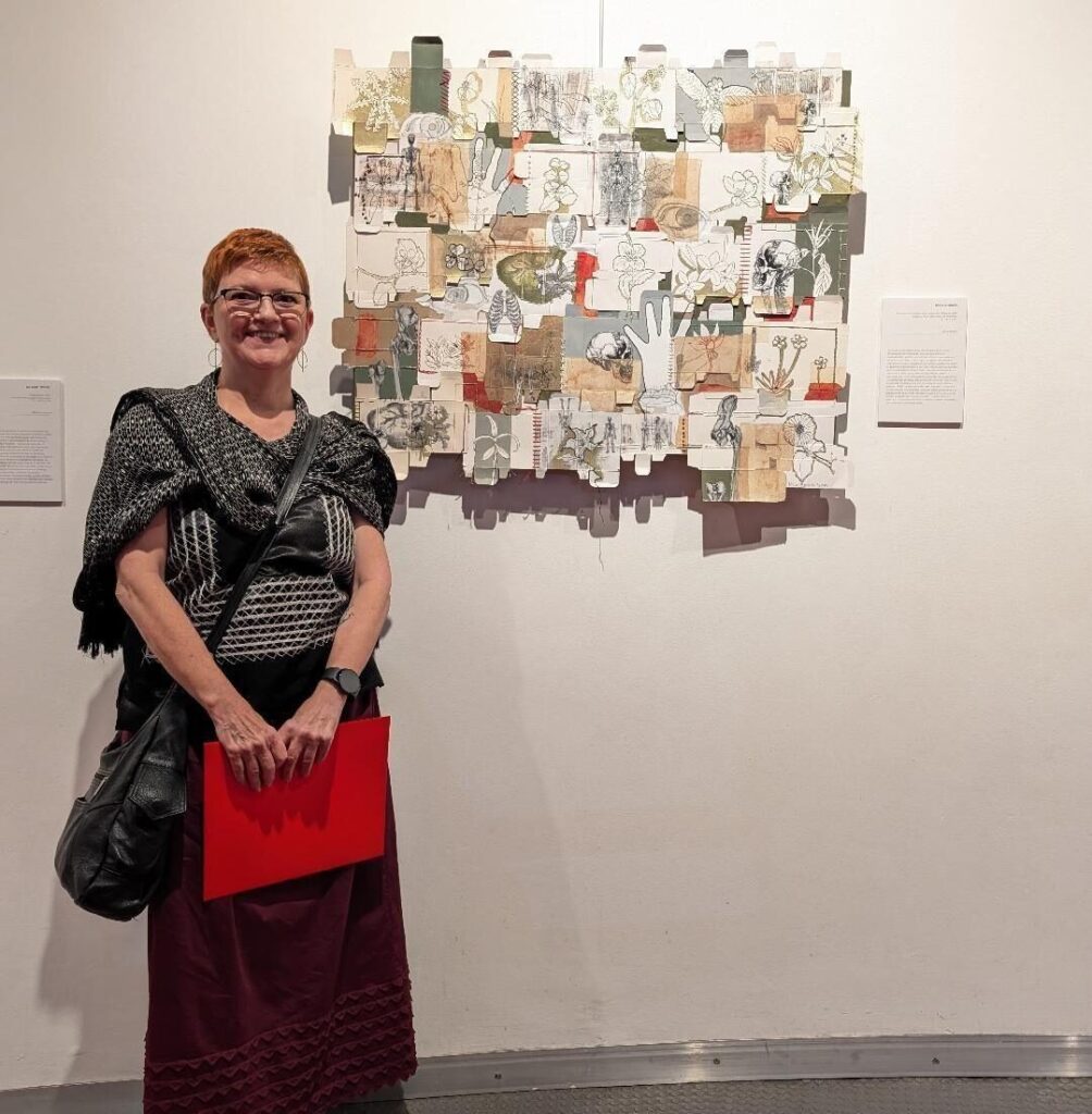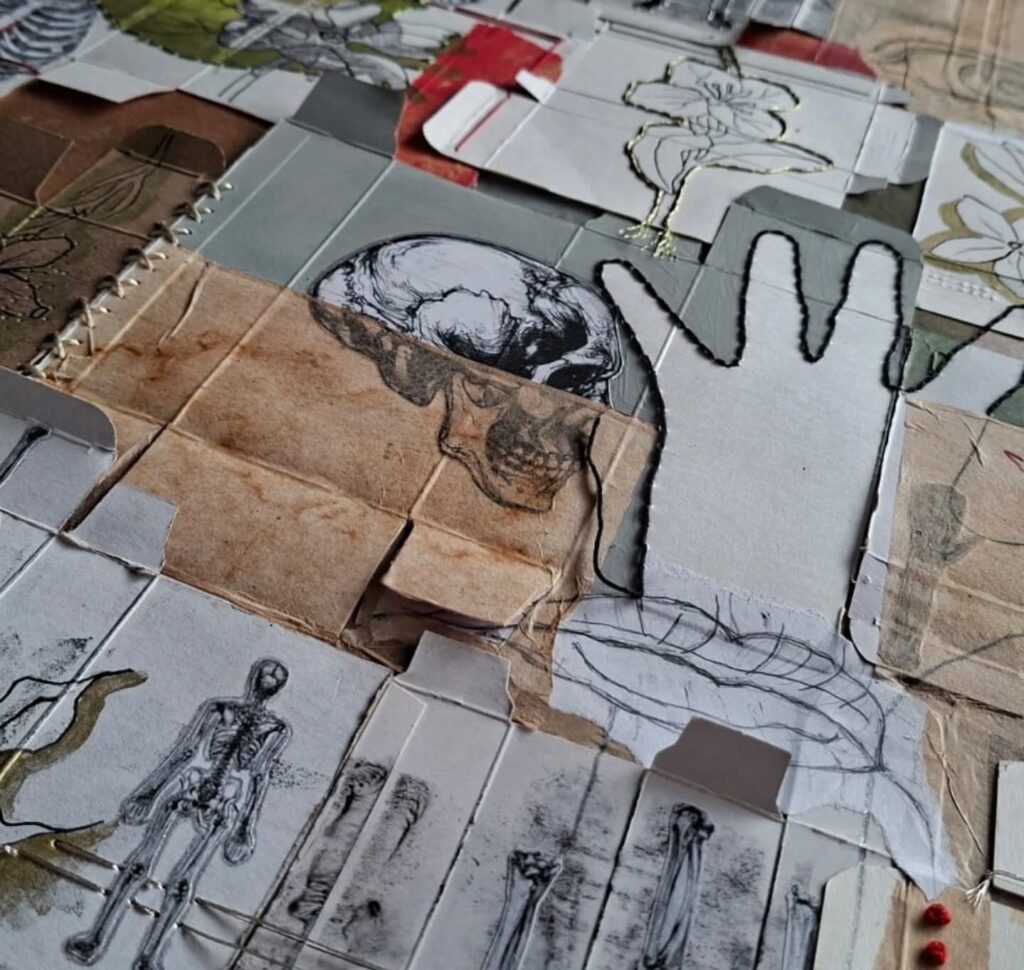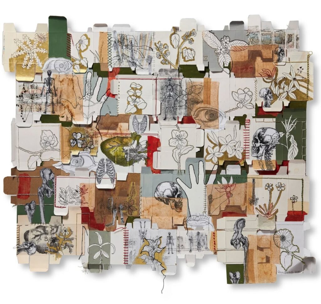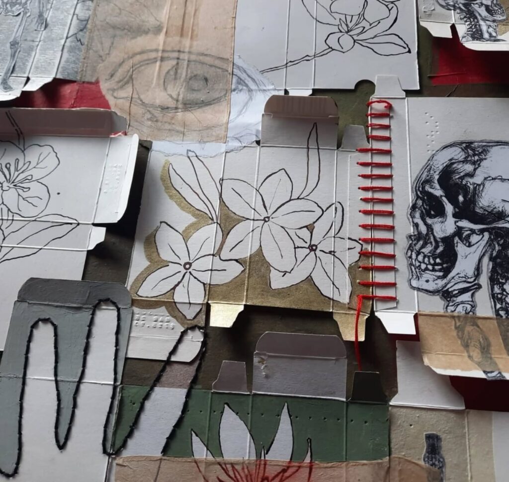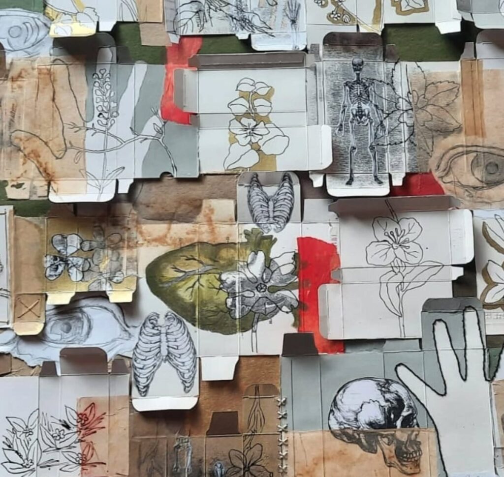 Se titula “Los cuerpos enfermos somos como las) malezas”. Está hecha con cajas de medicinas (sí, guardo todas las cajas de los medicamentos que tomo todos los días), bordado con hilos de algodón y metálicos, acrílico, impresiones digitales, dibujo, tinta y bolsas de te usadas.
