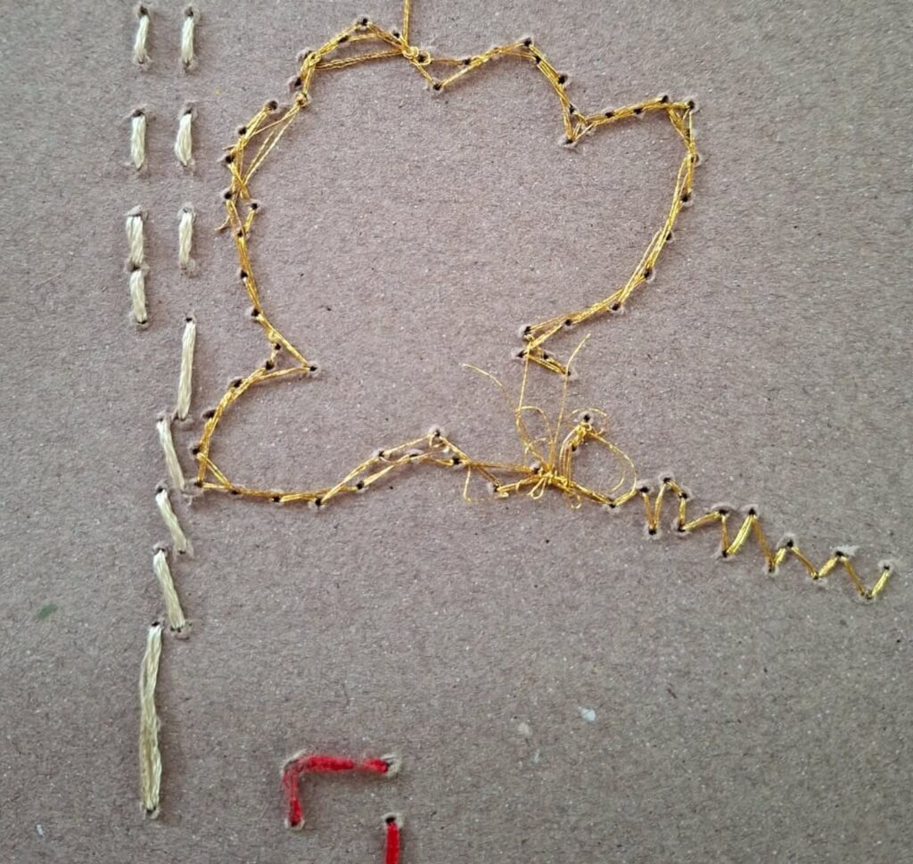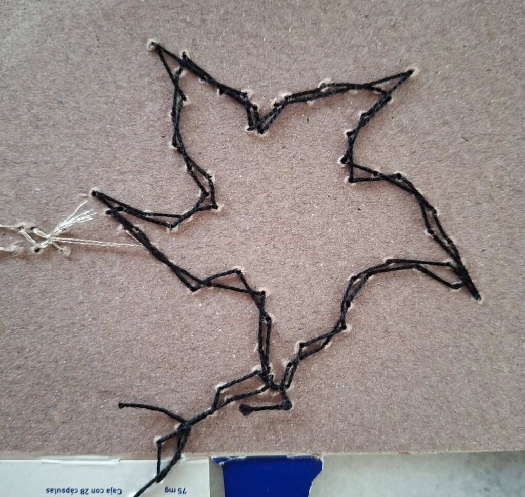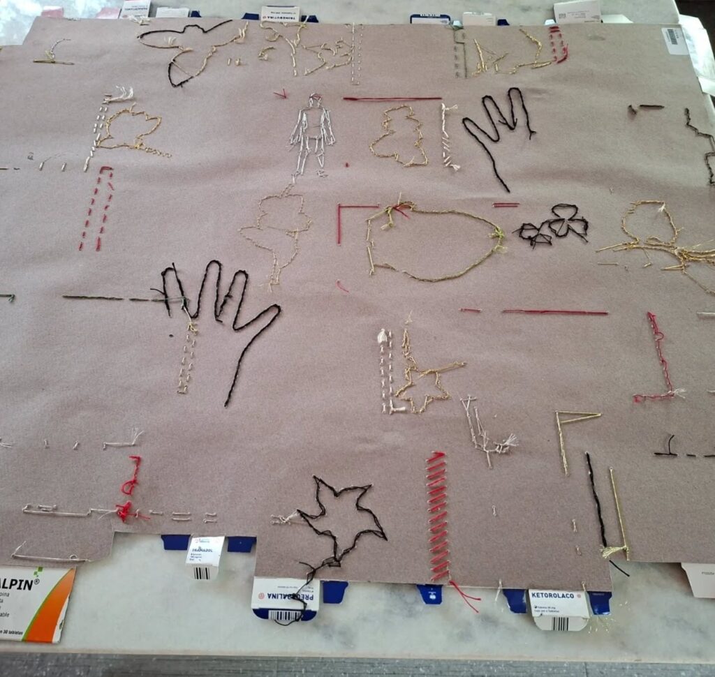 Esta pieza está hecha con algunas de las cajas de medicamentos que tomo diariamente hasta cuatro veces al día. Apela a generar reflexión y empatía en las personas que la observen, a través tanto de los materiales utilizados como del cuidado y la paciencia con la que está realizada: es una especie de quilt de cartón, integrado por texturas variadas, con detalles en pintura y con muchas puntadas bordadas con hilos diferentes, con paciencia con y mucho amor.