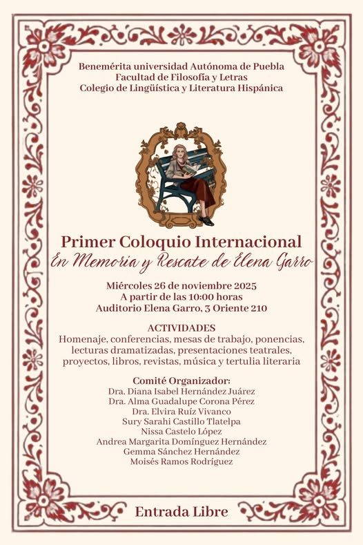 El programa completo del Primer Coloquio Internacional “En memoria y rescate de Elena Garro” será publicado en los próximos días a través de las redes sociales de la FFyL de la BUAP.