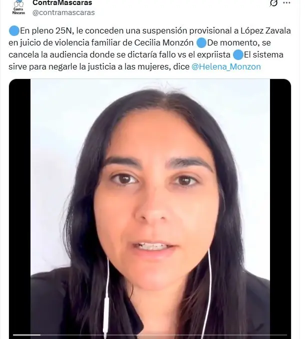 🔵En pleno 25N, le conceden una suspensión provisional a López Zavala en juicio de violencia familiar de Cecilia Monzón 🔵De momento, se cancela la audiencia donde se dictaría fallo vs el expriista 🔵El sistema sirve para negarle la justicia a las mujeres, dice @Helena_Monzon pic.twitter.com/thXHxXRGMC