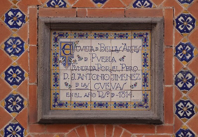 Placa de la Escuela de Bellas Artes de Puebla, colocada en la Casa de las Bóvedas, en Puebla, México.