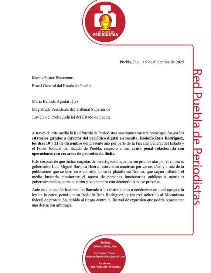 Hacemos nuestro el llamado que este 9 de diciembre ha hecho público la Red Puebla de Periodistas.