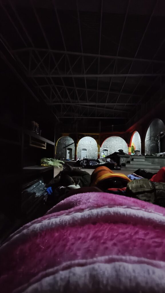 El camión me llevó hasta la parada donde dormiría esa primera noche, mientras los demás caminaban 10 km más para concluir un trayecto de 50 kilómetros. Una vez todos reunidos, comimos en las mesas y sillas que transportaba el camión, las cuales de manera improvisada armaron en el parque de Xaltocan, al dar las 6:00 p.m., comencé a preparar mi cama, un colchón de campamento, con bolsa de dormir y 2 cobijas fueron el cobijo de esa noche y las siguientes. Dormí en el Auditorio Municipal, el cansancio era suficiente como para no importar que estaba prácticamente en el piso rodeada de personas desconocidas bajo un techo alto de lámina.