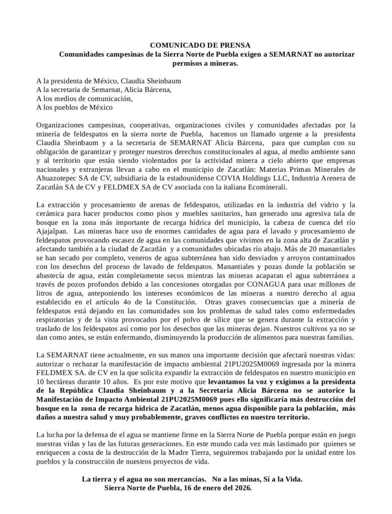Organizaciones campesinas, cooperativas, organizaciones civiles y comunidades afectadas por la minería de feldespatos en la sierra norte de Puebla, hacemos un llamado urgente a la presidenta Claudia Sheinbaum y a la secretaria de SEMARNAT Alicia Bárcena, para que cumplan con su obligación de garantizar y proteger nuestros derechos constitucionales al agua, al medio ambiente sano y al territorio que están siendo violentados por la actividad minera a cielo abierto que empresas nacionales y extranjeras llevan a cabo en el municipio de Zacatlán: Materias Primas Minerales de Ahuazotepec SA de CV, subsidiaria de la estadounidense COVIA Holdings LLC, Industria Arenera de Zacatlán SA de CV y FELDMEX SA de CV asociada con la italiana Ecominerali.