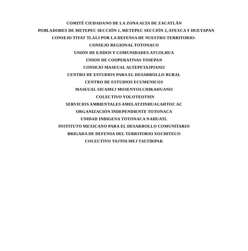 La SEMARNAT tiene actualmente, en sus manos una importante decisión que afectará nuestras vidas: autorizar o rechazar la manifestación de impacto ambiental 21PU2025M0069 ingresada por la minera FELDMEX SA. de CV en la que solicita expandir la extracción de feldespatos en nuestro municipio en 10 hectáreas durante 10 años. Es por este motivo que levantamos la voz y exigimos a la presidenta de la República Claudia Sheinbaum y a la Secretaria Alicia Bárcena no se autorice la Manifestación de Impacto Ambiental 21PU2025M0069 pues ello significaría más destrucción del bosque en la zona de recarga hídrica de Zacatlán, menos agua disponible para la población, más daños a nuestra salud y muy probablemente, graves conflictos en nuestro territorio.