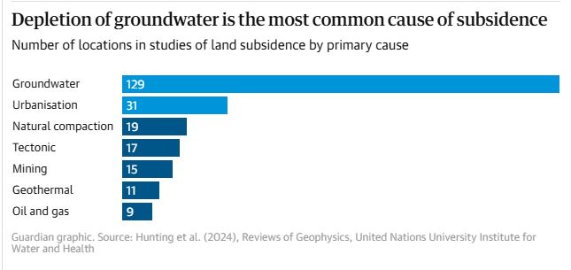 La sobreexplotación de las aguas subterráneas estaba provocando el hundimiento de ciudades en todo el mundo. Rafsanjan, en Irán, se hundía 30 cm al año; Tulare, en Estados Unidos, unos 28 cm al año; y Ciudad de México, unos 21 cm al año. Yakarta, Manila, Lagos y Kabul fueron otras grandes ciudades afectadas. Entre las señales más visibles de esta escasez hídrica, según el informe, se encontraban los 700 sumideros que salpicaban la llanura de Konya, en Turquía, con una intensa actividad agrícola.