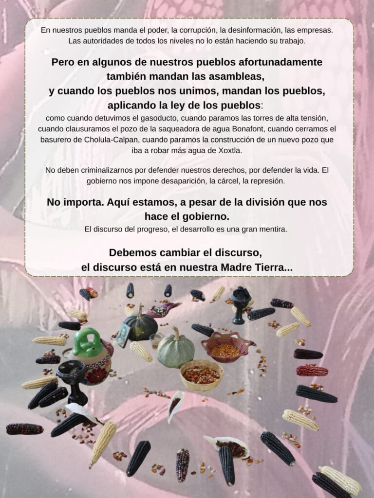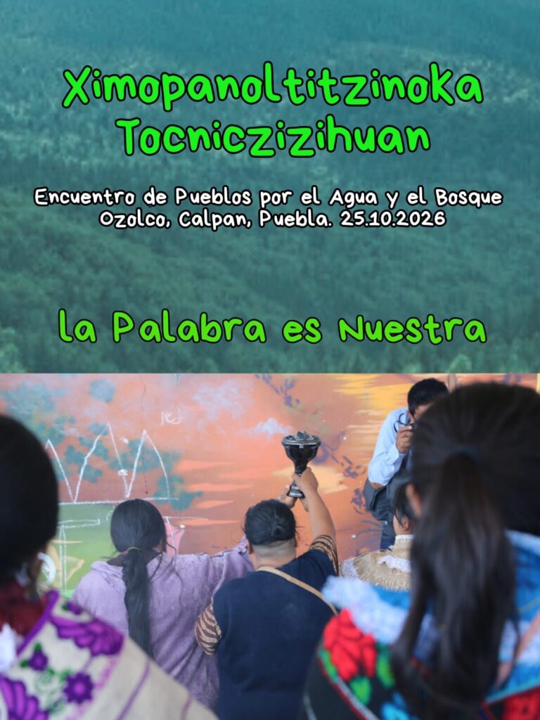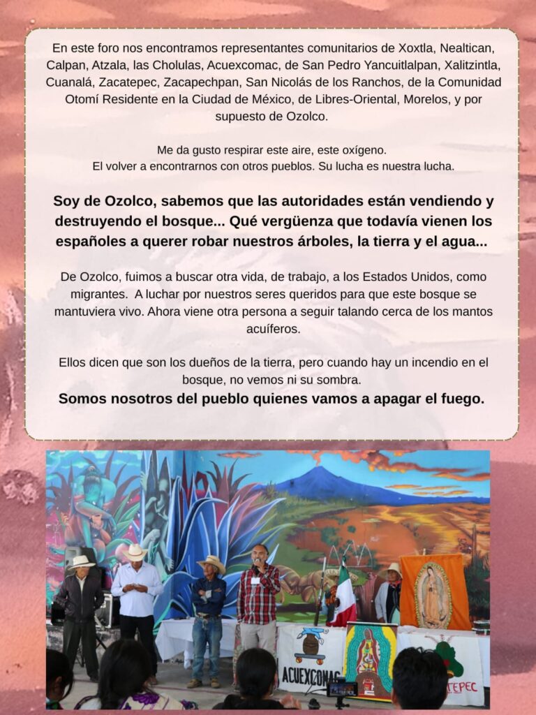 Reunidos los Pueblos Cholultecas y de los volcanes. En plaza pública, por la defensa del bosque del Izta-Popo, del agua de las cholulas y de los territorios. Contra la tala que están haciendo los ricos hacendados, la contaminación del agua y contra los basureros.