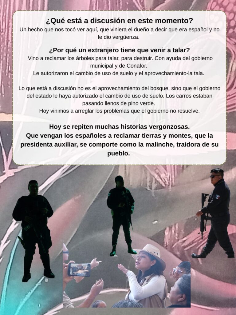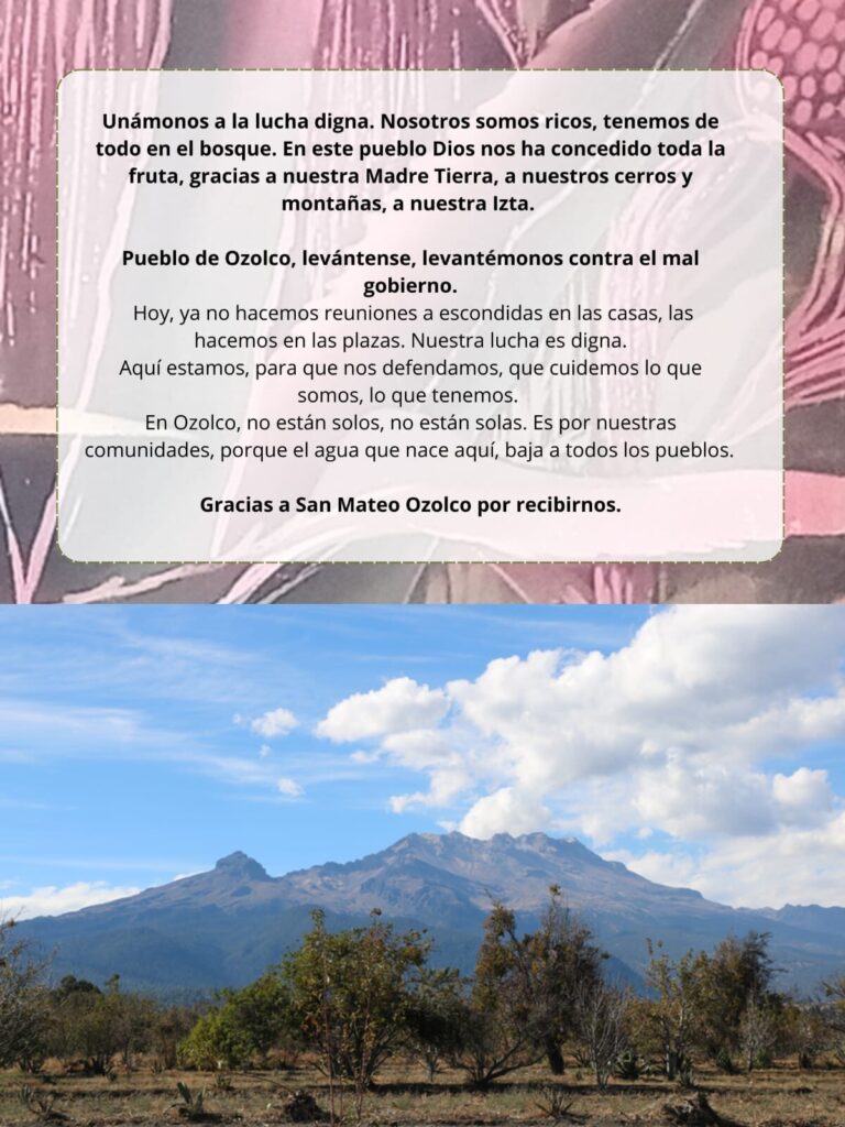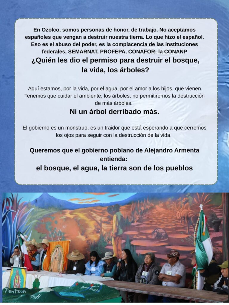 Yo soy de Ozolco… Y sabemos que las autoridades están vendiendo y destruyendo el bosque.. Que verguenza que todavía vienen los españoles a querer robar nuestros arboles, la tierra y el agua… Pueblo de Ozolco, levántense, levantémonos.. Que nos defendamos. Que cuidemos lo que somos, lo que tenemos… Ozolco, no estan solos, no estamos solas… Es por nuestras comunidades. Unámonos a la lucha digna…