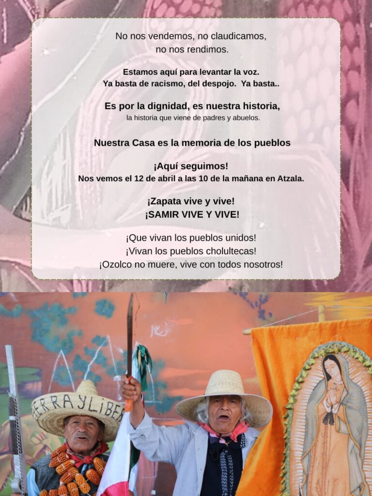 Les saludamos desde Morelos. Desde las luchas contra la termoeléctrica, el gasoducto, el saqueo de Agua. Somos la lucha de Samir, de Zapata… Hoy se repiten muchas historias vergonzosas.. Que vengan los españoles, la presidenta auxiliar, de malinche, traidora de su pueblo…