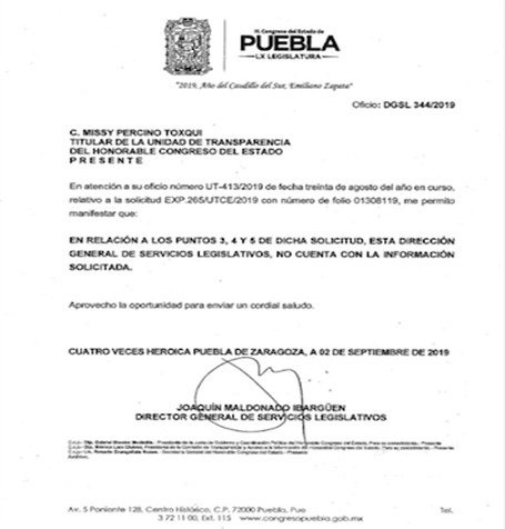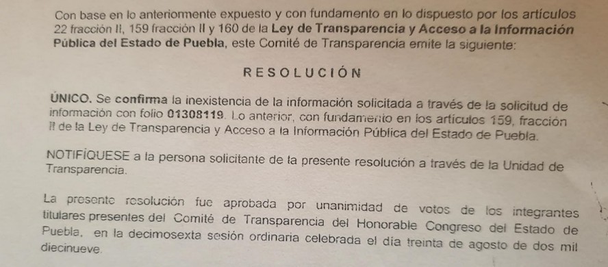 Para 2019 y nuevamente a través de otra solicitud de información de un integrante de Hermanos Serdán, número 01308119 dirigida a la Cámara de Diputados local, se logró saber que la aprobación del contrato de concesión no pasó por el Congreso como lo marca la ley. La Secretaría General, la Unidad de Transparencia y la Dirección de Servicios Legislativos del Congreso del estado confirmaron que no hay registro en actas de sesiones de trabajo de las Comisiones y Comités, así como las versiones estenográficas de las sesiones del pleno y de la Comisión Permanente, sobre la aprobación del título de concesión que privatiza los servicios de agua, drenaje y saneamiento en Puebla y 25 organismos operadores. (Se anexa oficio)