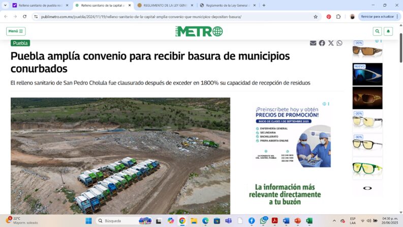 18.- Contrario a lo manifestado y a pesar de que las autorizaciones para la existencia y operación del relleno sanitario de Chiltepeque no deberían existir por lo anteriormente fundamentado en la presente, otro hecho que debe sumar y derivar en la clausura urgente, total y definitiva del relleno en referencia, es que el basurero de Cholula, Puebla, dejó de funcionar desde el 21 de marzo de 2024, por lo que el Relleno de Chiltepeque recibe a la fecha además de los residuos del municipio de Puebla, los residuos de municipios como San Pedro Cholula, San Andrés Cholula, Huejotzingo, Coronango, Amozoc, Cuautlancingo y Ocoyucan, lo cual reafirma que el relleno sanitario de Chiltepeque, Puebla no cuenta con un manifiesto regional, el cual es un requisito previo para su operación y existencia, hecho irrebatible que sustenta la acción de clausura urgente, total y definitiva del relleno de Chiltepeque.