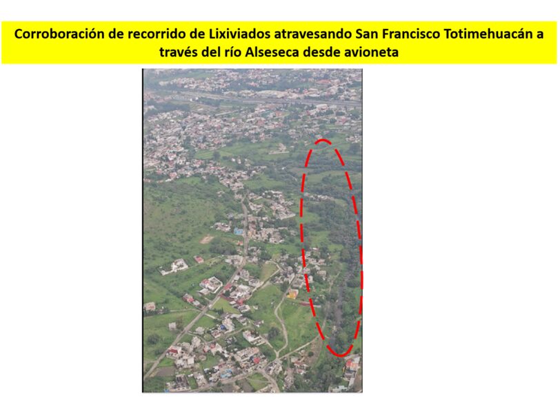 - Desde Valle de Los Angeles, el río Alseseca se carga de la mezcla masiva de lixiviados pasando por la Guadalupana, El resurgimiento, Santa Clara La Venta, y atraviesa por toda la junta auxiliar de San Francisco Totimehuacán con una población de 200,000 habitantes.