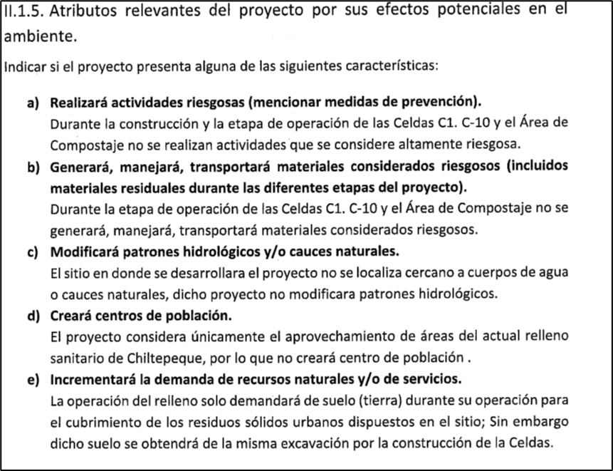 14.- Siendo que el Manifiesto de Impacto Ambiental (MIA) es un requisito tanto realizarlo quien lo solicita para la autorización de operación de un proyecto o de actividades, como que las autoridades pertinentes lo evalúen, comprueben y aprueben, el relleno sanitario de Chiltepeque no cuenta con un MIA veraz y por lo tanto legal, debido a que no solo omite, sino que niega que el proyecto se encuentra cercano a cuerpos de agua o causes naturales y niega que modifica patrones hidrológicos.
