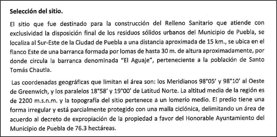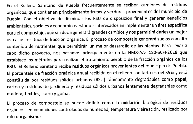 16.- Sumado a lo anterior, el documento manifestación de impacto ambiental proporcionado a este colectivo describe en su capítulo II “Descripción general de la obra o actividad proyectada”, que el relleno sanitario Chiltepeque recibe residuos orgánicos del municipio de Puebla. (Imagen)