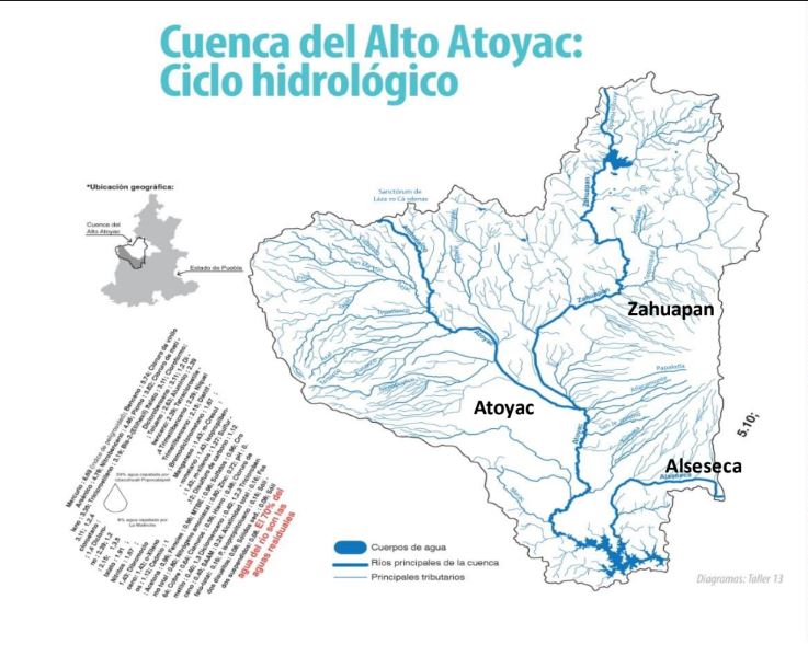 Me doy tiempo para mirar las fotografías, y para pensar en este río nuestro y su cuenca. Por ejemplo, ¿cuántos ríos como el Xochiac y el Xopanac forman el Atoyac? Casi se pueden contar en la gráfica elaborada para Dale la cara al Atoyac, A.C, que presenta esos veneros casi como un corazón, y si lo intento pierdo la cuenta más allá de los cincuenta.