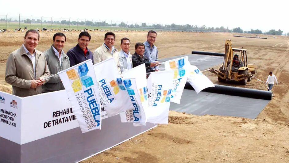 Inicio de rehabilitación de la planta de tratamiento en marzo de 2014. Moreno Valle inaugura los trabajos de rehabilitación de la planta de tratamiento en Xalmimiluco, a unos metros del río Xopanac, con los trascabos instalando el tendido plástico de la geomembrana que impedirá que los lodos filtrados por la planta vayan a dar al subsuelo.