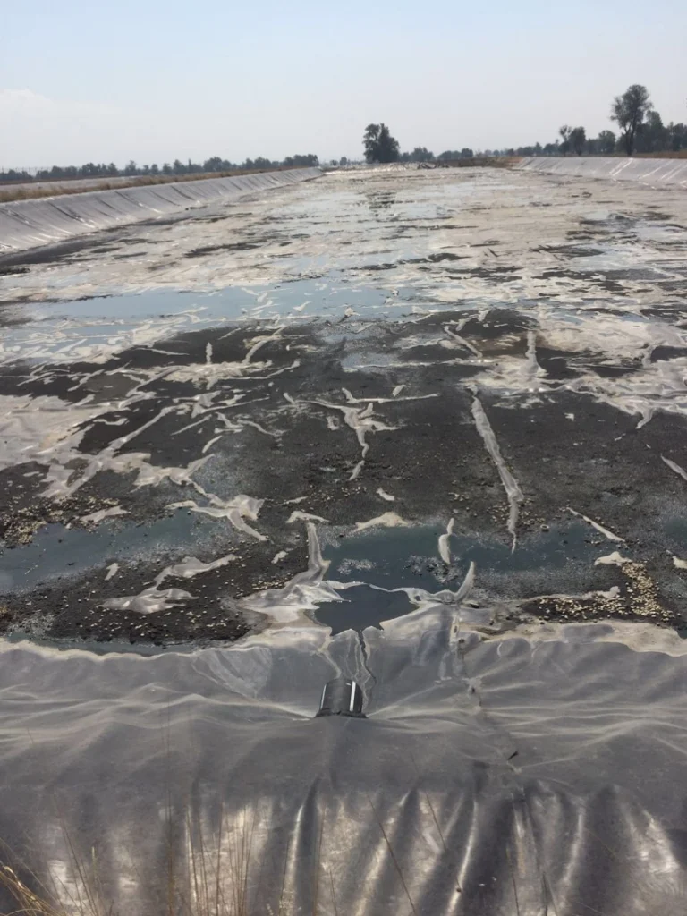 Planta de tratamiento en Santa Ana Xalmimilulco: una de las dos lagunas con la geomembrana en franco deterioro.