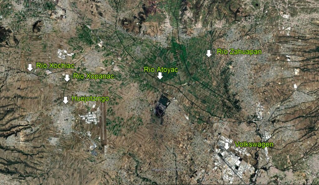 La vista abierta a los ríos Xochiac y Xopanac en su confluencia con el Atoyac; la Ciudad Textil, con la ciudad de Huejotzingo a la izquierda y el aeropuerto a la derecha; el río Zahuapan que baja desde los pueblos tlaxcaltecas que ya forman parte de la zona metropolitana de la ciudad de Puebla, que en su punto norte ve pasar al Atoyac por el entorno de Volkswaagen.