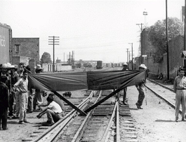 Bandera de huelga en las instalaciones ferroviarias en la colonia Guerrero en 1958.El movimiento ferrocarrilero de 1958 se inició por aumento salarial, posteriormente ante la negativa de la empresa Ferrocarriles Nacionales de México derivó en la exigencia de democracia sindical, con Demetrio Vallejo y Valentín Campa como líderes. En 1959 se desata la huelga, los principales líderes fueron encarcelados y despedidos cientos de trabajadores. Fue una gran derrota obrera.