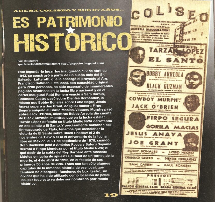 La arena Coliseo para lucha libre y boxeo, fue inaugurada en 1943, por Salvador Lutherot, está ubicada hasta la actualidad en el centro histórico de la ciudad, en la calle de Perú # 77, entre las calles de República de Brasil y República de Chile. Ahí se efectuó noviembre de 1952, el emblemático combate de la lucha de máscaras entre El Santo y Black Shadow. Hacia 1950 la afición por la lucha libre creció tanto que en 1956 se inauguró la Nueva Arena México, para tal efecto. Y la Arena Coliseo se quedó como el escenario principal del boxeo.
