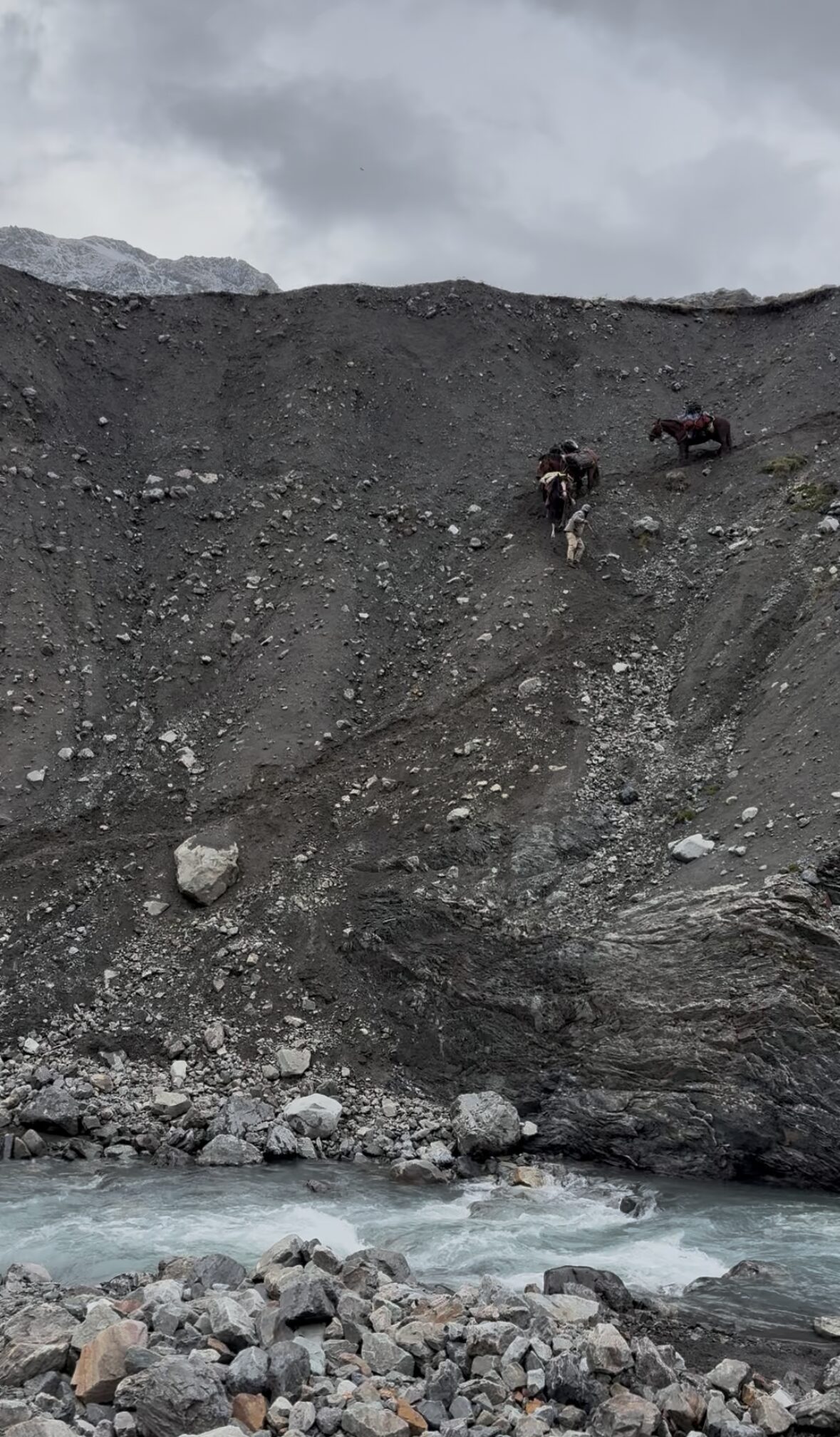 La jornada comenzó con la primera prueba real. Avanzamos por un valle cubierto de piedras redondas, arrancadas del monte por siglos de erosión glacial. Llegamos a un paso al borde de un profundo tajo, con rocas sueltas y arena que caían hacia el río.