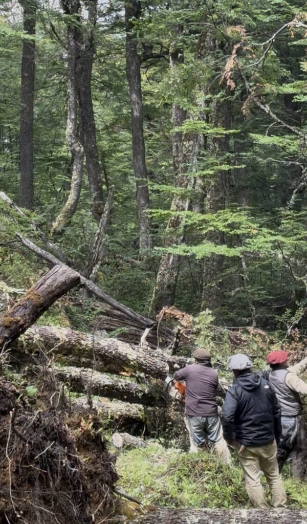 La huella, que ya de por sí era exigente, amaneció bloqueada por grandes árboles derribados por el viento. Troncos atravesados como barricadas naturales obligaban a detener la marcha una y otra vez. Los guías se adelantaban con motosierra y hacha; el resto esperaba en silencio, sosteniendo a los caballos que resoplaban con impaciencia.
