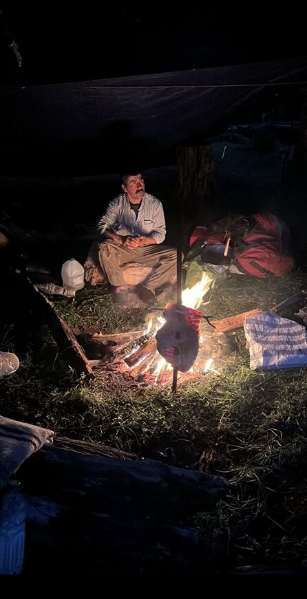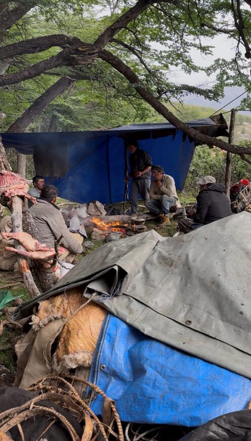 Gustavo y Florentino, baqueanos de palabra justa, leen el terreno con una atención que no se aprende en libros; Braulio siempre recio y sonriente cuida la retaguardia; David, atento, sostiene algo esencial: la comida caliente al final de la jornada.
