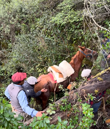 Los guías reaccionaron con rapidez. Bajaron, abrieron paso entre ramas y troncos usando machete y hacha, despejando el espacio para poder trabajar. El caballo permanecía inmóvil, respirando con dificultad, recostado en el lodo, como si estuviera tomando fuerzas. No se sabía si estaba lesionado.