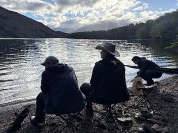 En casa de Don Florentino nos esperaba un cordero al palo. Compartimos la mesa con su familia, una de las familias pioneras de Villa O’Higgins. Hubo música de guitarra, corridos y canciones del sur. Gustavo nos sorprendió con su talento al acordeón y canto de canciones mexicanas. La celebración fue sencilla, sobria y profundamente humana.