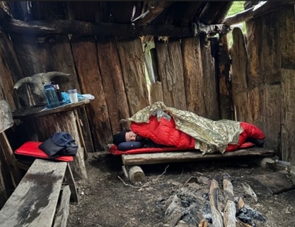 Se recostó en el tablón, avivando el fuego como guardián voluntario, y se cubrió con los restos desgarrados de un cobertor aluminizado que encontró allí. El cobertor había sido usado antes, quizá por Ingrid y Rafa, quienes el 9 de febrero de 2025 dejaron unas letras escritas en un tablón como recuerdo de un “Buen Campamento”.