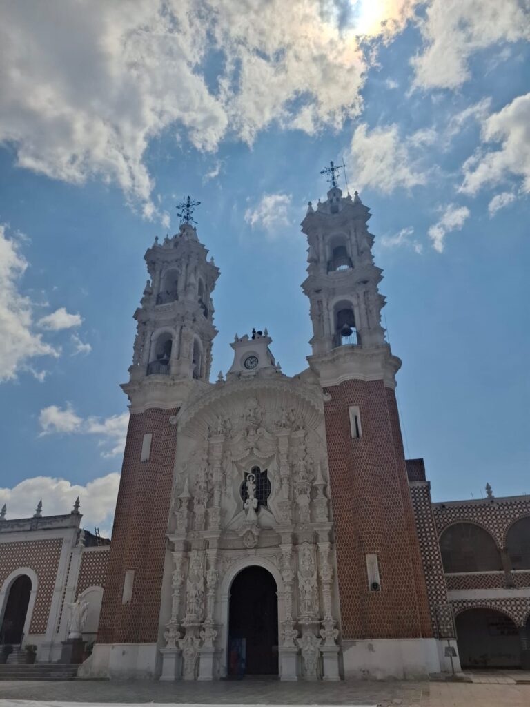 Hoy, en este miércoles de Semana Santa, en el atrio de la iglesia de Nuestra Señora de Ocotlán, el cielo de Tlaxcala es de un azul intenso y el sol de las doce del día ilumina la fachada de la Iglesia tan blanca que casi nos ciega. Es de argamasa, cual si fuera un retablo de dulce consagrado a la Virgen María, a San Francisco de Asís, a San José. La imagen central de la Virgen está rodeada de los arcángeles y en la parte superior de la misma, se encuentran frutos tropicales, todo protegido por una gran concha. Al igual que la Casa del Alfeñique, se antoja morderla y desprender las figuras para el goce del paladar.